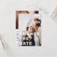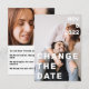 Meddela dina uppdaterade bröllop-planer med denna ultratunna moderna ändring av datumkortet, designat för att kombinera chic med minimal elegans. Stor, fetstilt vit text överträffar ditt eget romantiska foto och tar omedelbart upp det, medan baksidan ger utrymme för en annan bild och all viktig händelseinformation. Den rena layouten och den lättlästa typografin garanterar att ditt budskap är tydligt, skapar det perfekten att hålla nära och upphetsade för din stora dag.