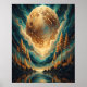 Denna digitala konst visar en surrealistisk och förtrollande scen där en massiv, strukturerad planet dominerar himlen och kastar ett varmt, gyllene sken över ett lugnt skogslandskap. Planeten, med sina invecklade ytstrukturer, syns sväva ovanför en lugn sjö och reflektera sitt ljus och sina färger i vattnet nedanför. Höga tallar står på klippiga stränder och deras silhuetter ger kompositionen djup. Himmelen är fylld med virvlande mönster i teal, guld och djupblått som ger en känsla av rörelse och energi. Samspelet mellan ljus och skugga, i kombination med sjöns reflekterande yta, frammanar en känsla av undran, frid och kosmisk skönhet. Denna bild fång
