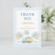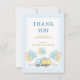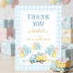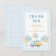 Säg tack i söt stil med detta dumper första födelsedag tack-kort! Med en söt lastbil som bär presenter och ballonger med mjukt babyblått gingham-mönster och prickiga kanter är det perfekt för en pojkes första födelsedagsfest. Idealiskt för att tacka gäster och komplettera din festliga brevpappersuppsättning med en charmig finish.