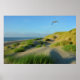 Sanddünen mit grünem Strandhafer an der Nordcompüste auf Zeeland in den Niederlanden, mit Meer, blauem Himmel und einer Möwe