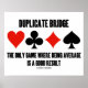Om du spelar en dubbelbro kommer du att njuta av bron humor med den här poster som innehåller de fyra kortens kostym tillsammans med ordspråket "Duplicate Bridge - the only Game where Is Average is a Bra Result" (Dubblettbron - det enda spelets medelvärde är ett resultat för ). Få andra att göra en dubbla av genomsnittskonceptet och att komma till ett genomsnittligt spel i bron med detta minnesvärda bron som säger poster!