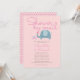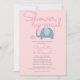 En charmig inbjudan med söta föräldra- och bebantelefanter med hjärtan och personliga detaljer för baby shower, sprinkle eller par-shower via post på distans på en baby rosa bakgrund. Baksidan har ett rosa prickmönster på en baby rosa bakgrund. Designad av Thisisnotme©