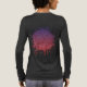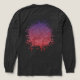 Denna skjorta känns som att bära det sista ekot av en kraftfullt skymningslåt. Den cirkulära färgsprutningen sprider sig över baksidan som en ljudvåg fångad på höjden av en refräng. Djupt violett smälter in i rökigt karmosinrött och glödande rött och skapar en övergång som fångar stämningen av musik som spelas under svagande kvällsljus.