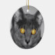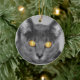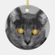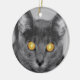 Ett foto tittar rakt i ansikte på en grått-katt med guldglödande öga. Redigerad med selektiv färgning för att framhäva det meseriserande ögat.