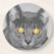 Ett foto tittar rakt i ansikte på en grått-katt med guldglödande öga. Redigerad med selektiv färgning för att framhäva det meseriserande ögat.