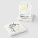 Dusty Blue Vattencolor blommor, arch och initialer vår bröllop underlägg. Den här fina bröllop-designen har ett bågstycke ram med blå kaktus blommor och löv på det lämnat hörnet och på initialer. Namn är i skripttypografi.