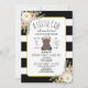 En inbjudan till babydusch med en illustration av en björn i baby som bär en dammig rosa blomma krona. Anpassa texten. Bakgrunden är svart och vit stripe mönster.