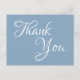 Anpassadets vita kalligrafiktextmeddelande "Tack!". Blått eller dammigt blått och vitt vykort. Ett typsnitt för chic för bröllop, möhippa- och babyduschar och andra evenemang. Anpassa färg för bakgrund och teckensnitt.