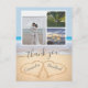 Beach Wedding Tack Postcard. Med 3 fotokollage, 2 hjärtan i sanden, tealblått bakgrund