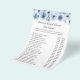 Gör din möhippa oförglömlig med det här Dusty Blue Blommigt Bröllop Möhippa Shoe Game Card. Den vackra blommigten i ett blått färg är säker på att imponera på gästerna och skapa snyggt och elegant. Skidspelet på kortet är en roligt och ett engagerande sätt att engagera alla i firande. Det här spelet är perfekt för alla åldrar och kommer säkert att ge dig en hel del skratt och glädje till ditt evenemang.