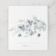 Det moderna platskortet har en vattenfärg, dammiga blå vilda blommor och eukalyptus greenery. Koordinater med dammig blå vildblomma bröllop svit.