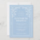 Fintvätt av vita blommar som intertwine skapar en vacker blommigt ram, som tar till sig den tidlösa elegansen i kärlek. Glamorös inbjudningskort för möhippan blandar modern estetik med klassisk art nouveau. Ornate white geometric ram i en dammig blå bakgrund framkallar drama och romantik. Sofistikerade och distinkta, de lämnar ett bestående intryck. Gå med oss för ett oförglömligt firande med fängslande utformning och elegant. Med en modern centrifugering på art nouveau visar dessa inbjudningar ett ornat, vitt geometriskt ram och intrikat ornamenterande. De känsliga detaljerna tillför en luft av elegans och förfining, som kompletterar den övergripande utformningen perfekt.
