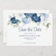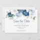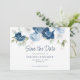 Vattenfärgkort för blommigt i elegant, dammigt blått, vitt och marint blommigt bouquet bröllop spara datum kort. Kortet har ett modernt skript "Spara datumet" som kan ändras till en typsnittstyp som du väljer och som är tillgänglig här när du klickar på knappen "Anpassa".