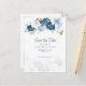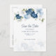 Vattenfärgkort för blommigt i elegant, dammigt blått, vitt och marint blommigt bouquet bröllop spara datum kort. Kortet innehåller ett skript "Spara datumet" som kan ändras till en typsnittstyp som du väljer och som är tillgänglig här när du klickar på knappen "Anpassa".