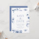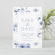 Meddela din speciella dag i stil med den här eleganten dammiga blå blommigt Spara datumkortet. Den här designen har delikata vattenfärgblommor i mjuka blåtoner och klassisk serif-typografi och är perfekt för romantiskt, tidlöst eller trädgårdsininspirerat bröllop. Helt anpassade med dina detaljer, det är en fin ton för firande och låter dina gäster känna till att markera sina kalendrar.