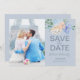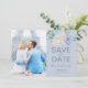 Den här dammiga blå blommigten skifferfotot sparar datumkortet är perfekt för vår eller sommar-bröllop. Den stinkande designen har ljusblå persikor med persiko- och krämblommor i en vacker bukett. Anpassa kortet med förlovningens foto, namn, datum och plats för bröllop.