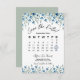 Det här Spara datumkortet har en vacker boho-chic med elegantens moderna skriptbokstäver och en gräns av ömtåliga vilda blommor i skuggor av dammig blått. Det finns en anpassade-kalender där du kan sätta ett hjärta runt datumet i bröllop. Det finns utrymme för parets namn, bröllop och webbplats. Baksidan är en underbar sage grönt färg med en sprit av samma blommor från land. Snyggt sätt att låta dina vänner och din familj veta att rädda datumet för din speciella dag.