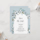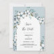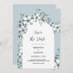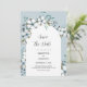 Vattenfärgade bomullsblommor och eukalyptus-gröntar. Dusty Blue - Spara datumet. Firar med den här söta samlingen