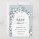 Vattenfärgade bomullsblommor och eukalyptus-gröntar. Dusty Blue Baby Shower-inbjudan. Firar med den här söta samlingen