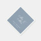 Bröllopsservetter för ett bröllop med dammig blå bröllopsfärg. Bara vit text på dammig blå bakgrund. Orden "Herr & Fru" är skrivna i ett elegant kalligrafiskt typsnitt, brudens och brudgummens namn och datumet i mindre versaler.