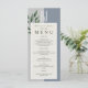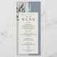 Enkel, modern, minimalistisk, botanisk, elegant grönt och dammig blå bröllop-meny med jättestort monogram - initialer överst, grönt och trendig kalligrafi.