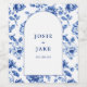 Personalize your reception wines with this dusty blue chinoiserie arched wedding bottle label, featuring delicate floral borders framing the couple's names and date in elegant serif text. The classic porcelainminspired design adds timeless sophistication to garden, coastal, or formal celebrations. Coordinates perfectly with blue floral stationery for cohesive "something blue" table accents.