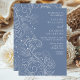 Den här inbjudan från elegant bröllop innehåller en delikat blommigt för prydnadsmönster med blommor, fåglar och löv i dammig blå bakgrund. Texten kombinerar handskript och serif typsnitt för en snyggt och ett modernt utseende. Perfekt för vinter- eller höstfallbröllop.