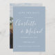 Med namnteckning stil namn kan den här elegantens dammiga blått spara datumkortet i personlig med din speciella bröllopsdag i chic typografi och ditt speciella foto på motsatt sida. Designad av Thisisnotme©