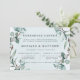 Utformningen har en utskriven färgad blad inslag i ljust grönt och dammiga blå nyanser. Vattenfärgsarbetsytan struktur med kalligrafiskript eller textskrivning för blå grönt. Underbar för bröllop firande!