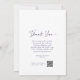 This elegant double-sided wedding card features a soft dusty blue floral border and timeless typography. The front showcases a heartfelt thank you message along with a QR code for guests to view and share photos from the big day. On the reverse side, a neatly arranged menu guides your guests through the evening’s culinary experience. Perfect for romantic, garden, or classic weddings seeking a personal and modern touch.