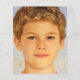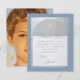 En modern första kommunion inbjudan. På en dammig blå rektangulär bakgrund finns en falsk silverfolie-båge som har dammig blå text på vit bakgrund inuti. Orden "Tack" och namnet är skrivna i ett elegant kalligrafiskt typsnitt; resten i versaler. På baksidan finns ett platshållar-foto av en pojke, från Pixabay, som är datorgenererat (inte en riktig person) och gratis för kommersiellt bruk.