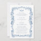 Den här eleganten toile-inspirerad bröllopsinbjudan visar en sofistikerad blått illustrerad ram av känsliga ro-vindruvor, präglat av tidlös charm och konstverk. Överst i designen fungerar en klassisk vapensköld med lush grey som perfekt för parets monogram, vilket gör att du får en aning anpassning. En dårbutik grund i ram kompletterar konstruktionen och förbättrar dess romantiska och förfinade estetik. Perfekt för par som vill ha en Fransk, vintage botaniskt eller trädgårdsälskande tema. Den här inbjudan fångar en luft av ära och tradition, samtidigt som den förblir oförtröttligt modern. Idealiskt för elegant bröllop, kombinerar man med en harmonisk blå palett med en mycket smal handdragning för att skapa en verkligt oförglömlig nyckelepé.