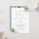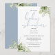 En elegant och stilfull inbjudan till babyshower med elegant dammig blå typografi och vacker botanisk grönskande växtlighet. Designad av Thisisnotme©