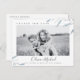 Modern chic vattenfärgsdammig blå botaniska bladgrönt med par-foto, enkelt och elegant, informera dina bröllop gäster om den uppdaterade informationen med detta foto om att ändra datum för uppskjutningskort för bröllop, underbar för modernt bröllop, rustiskt bröllop och botaniskt trädgårdsbröllop i vår och sommar.