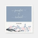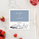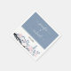 Dusty blue and black gren med blommor av rosa och namn bröllop papper napkin. Överdelen är täckt med ett dammigt blått band och namn i manustypografi medan grund är av vit färg med blå och svart gren med rosa blommor.
