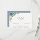 Vattenfärg blommig och lövrik arrangemang i nyanser av dammig blå, gul och grön, bröllopssvarskort med alternativ för måltidsval. Modern och elegant grå typografidesignstil mall. Baksidan av kortet har en solid dammig blå färg med två malltextrader för namn och datum.