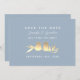 Elegant dammblått spara datumkortet som innehåller två guld-småfåglar som finns på ett ömtåligt gren. Det här kortet är ett romantiskt och minimalt designideal för modernt bröllop och är helt i anpassade med ditt namn- och bröllop-datum. Perfekt för vår, sommar eller tidigt faller på bröllop med ett mjukt pastel- eller guld-accenterat tema. Ett tidlöst meddelande för par som är kärlek enkelhet och sofistikerad.