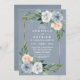Dusty Blue Guld Rosa Peach Rehearsal Middagsinbjudan - designen har en dammig blå bakgrund med vattenfärg, med en guld ram som trimmas i eukalyptus och grönt med blommigt inslag i grått/vitt, dammblått och rosa/persika. Visa matchningssamlingen på den här sidan om du vill söka efter matchande produkter.