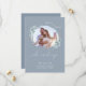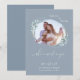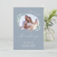 Vacker dammig blå med vit text - hon sa ja i handskriven kalligrafi. Spara datumet - två nyanser av dammig blå, lite mörkare på baksidan , accentuerar vår penseldragsfotoraffa - omgiven av ömtålig silverdollareukalyptusblad. Låt dina gäster veta att ni gifter er - och att de ska hålla er speciella datum öppet