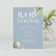 Baby i bloombabyduschinbjudan med elegant, dammig blå typografi och söt botaniskt grönt löv, och din QR-kod på motsatt sida. Designad av Thisisnotme©