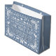 Dusty blue and white Kärlek, Peace, Joy papel picado jul-helgdag, stor presentväska i stil. Det visar upp flera jular i inslag, t.ex. en minimal Nativitetscen, Julgranar och hjort, änglar och duvor, och texten "Kärlek, fred och glädje" "Tro" och "Fa la la la la la la la la la" i vitt. Den har också blommor och punkter. Det här helgdag är i mexikanska folkkonst stil.