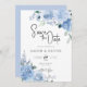 bröllop spara datum-kort för blommigtens vattenfärg. Elegantens blommigt sparar datumkortet med vackra, handmålade vattenfärgade blommor och grönska i dammigt blått med kalligrafi av eleganten och ljusblå bakgrund. Modern blommigt bröllop spara datum-kort. Du kan anpassa ordalydelsen, teckensnittet stil, färg och storlekt framför och bakom kortet. Kontakta mig gärna om du vill ha matchande artiklar.