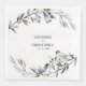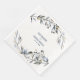 En napkin från elegant bröllop med handdragna dammiga blåmärken med löv och bär och två kycklingar, med namn och sifferdatum i dammblått.