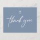 Anpassa detta dopkort för babypojke med dammig blå färg med ditt genomtänkta meddelande, namn och returadress. Modern typsnittsstil med en enkel vit korsdetalj.
