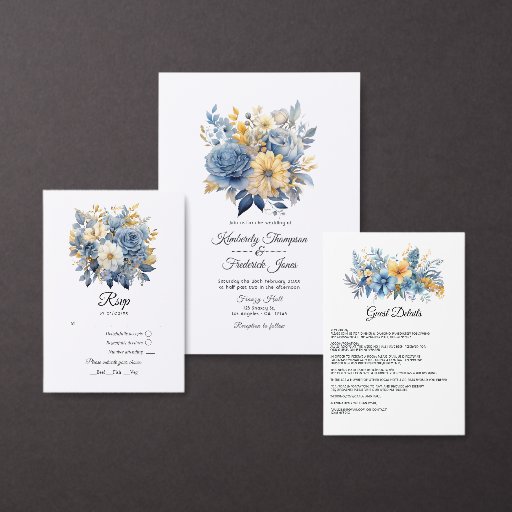 Dusty blue och guld blommigt bröllopsinbjudan med elegant typografi anpassade till dina händelsespecifikationer.