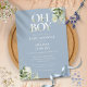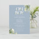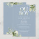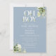 Oh boy bebisfest-inbjudan med elegant typografi och vacker botanisk grönska på en dammig blå bakgrund. Designad av Thisisnotme