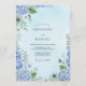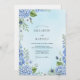 This design features a dreamy, artistic rendering of blue hydrangeas and delicate foliage. A soft watercolor wash in subtle blues creates an ethereal and romantic atmosphere, perfect for a refined celebration.