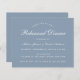 En enkel, minimalistisk inbjudan till repetitionsmiddag: bara vit text om dammig blå bakgrund. Ord "Förkortningsmiddag" och namn är skrivna i ett kalligrafiskt skript i elegant, resten med lock.