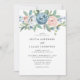 Bröllopinbjudan med elegant och blommigt med vattenfärg blommar upp och ned på grund. Färg omfattar dammblått, ro, vitt och ädelgrönt.
