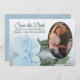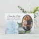 De här vackra korten är perfekten för att låta dina vänner och din familj veta att spara datumet för ditt kommande bröllop. De har en romantisk design med en enda dammig blått eller pulverblått blek ro som reflekterar i bassäng i vatten med vågar och krämer med foto i en ovalformad ram. Rubriken läser Spara datum med utrymme för namnen, datum och plats.